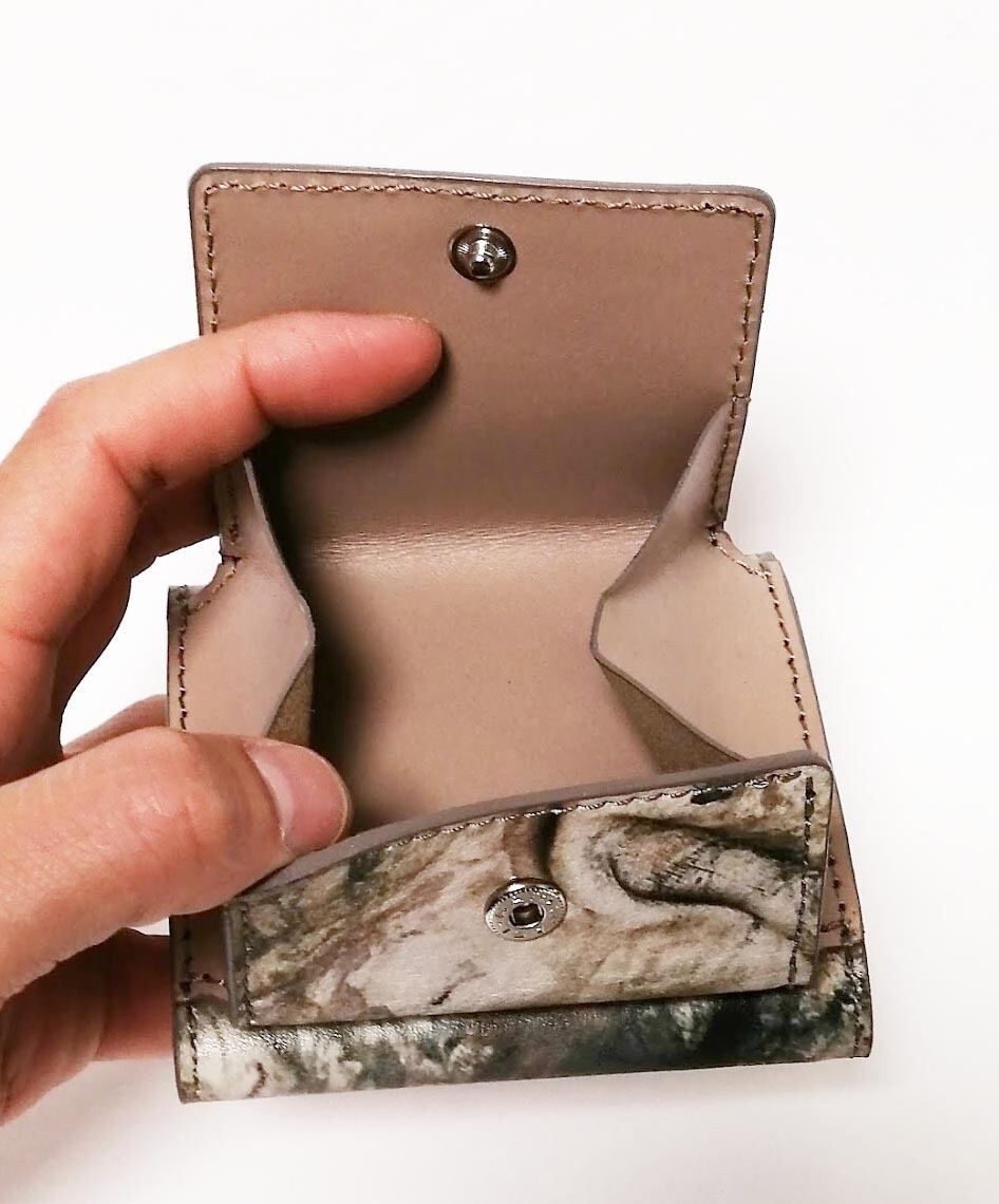 牛革にインクジェットを施したトリフォールド(三つ折り)ウォレットになります。 内側も総革で紙幣入れとカード入れが3箇所、外側に小銭入れがあります。 サイズ 縦8.3cm 横9.0cm 厚さ4.0cm(使い込むと厚みは薄くなっていきます。)