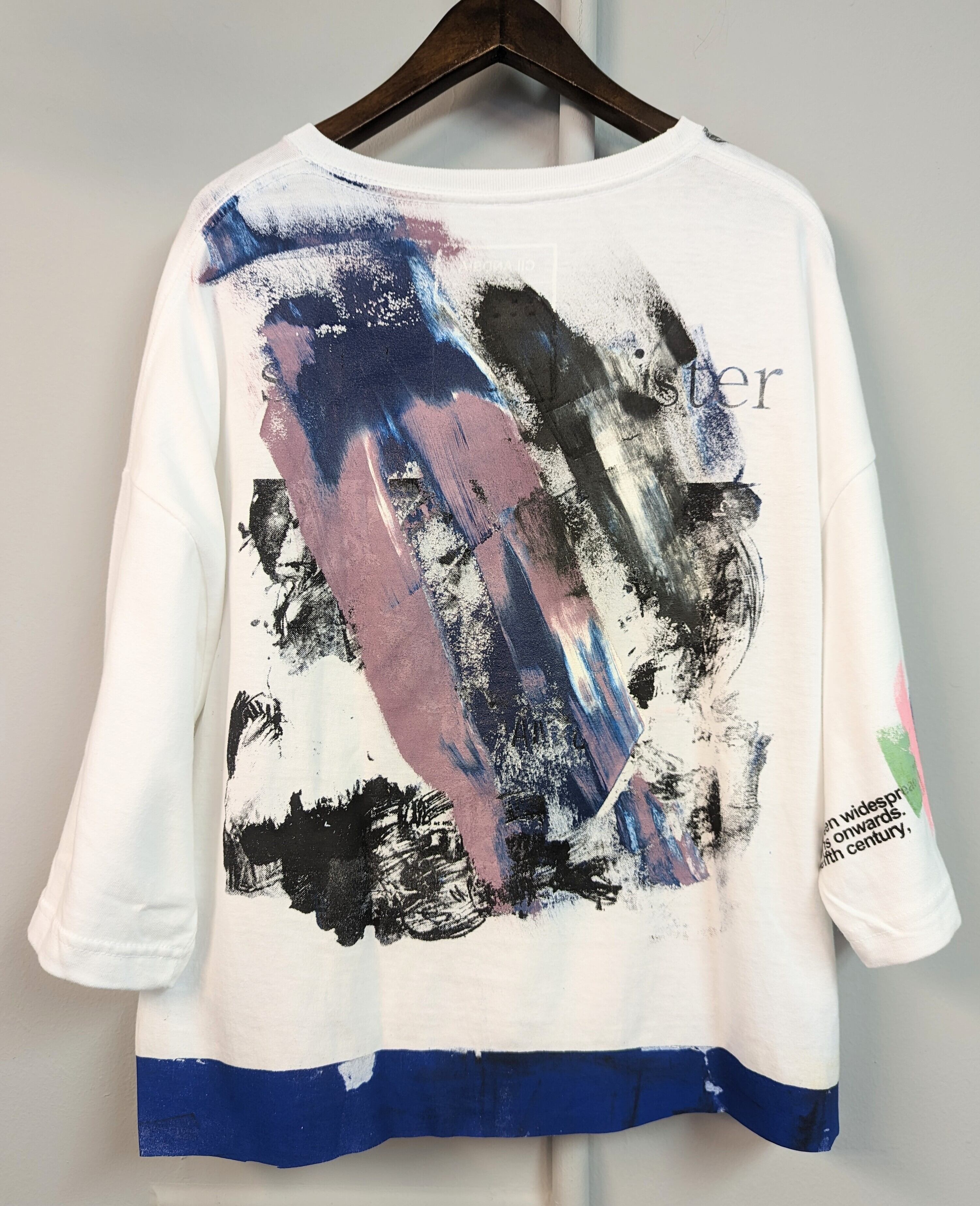 シルクスクリーンのone-off teeになります。 プリント中央部分はインクを置きスキージで刷りおろしています。 裾のみ断ち切りです。 着丈58 身幅60.5 肩幅62.5